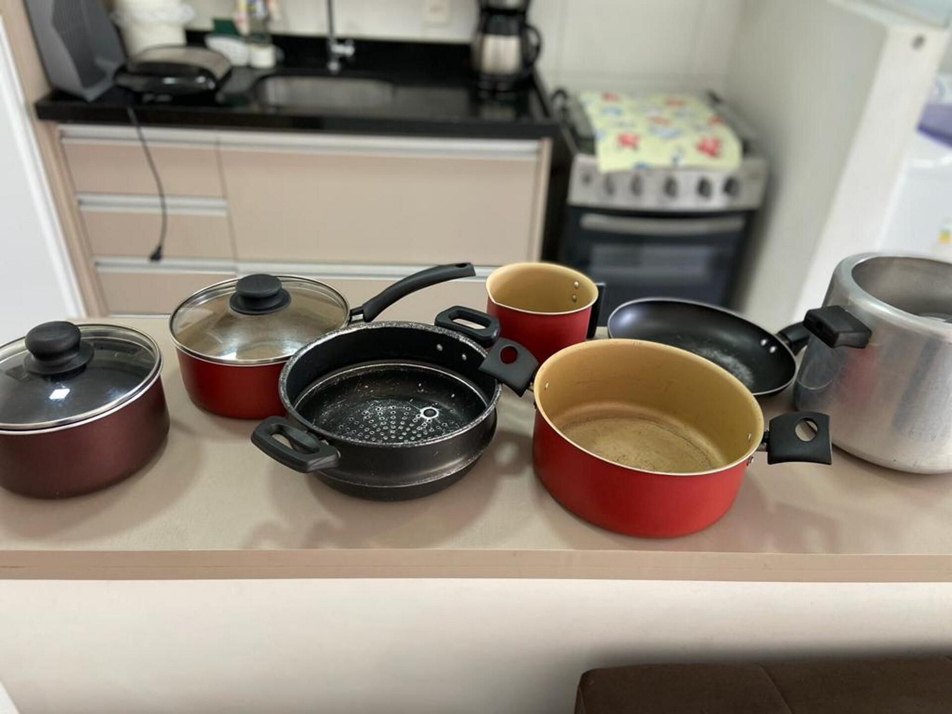 A cozinha americana está totalmente equipada com fogão 4 bocas, utensílios domésticos, micro-ondas, cafeteira, sanduicheira, filtro de água e máquina de lavar.