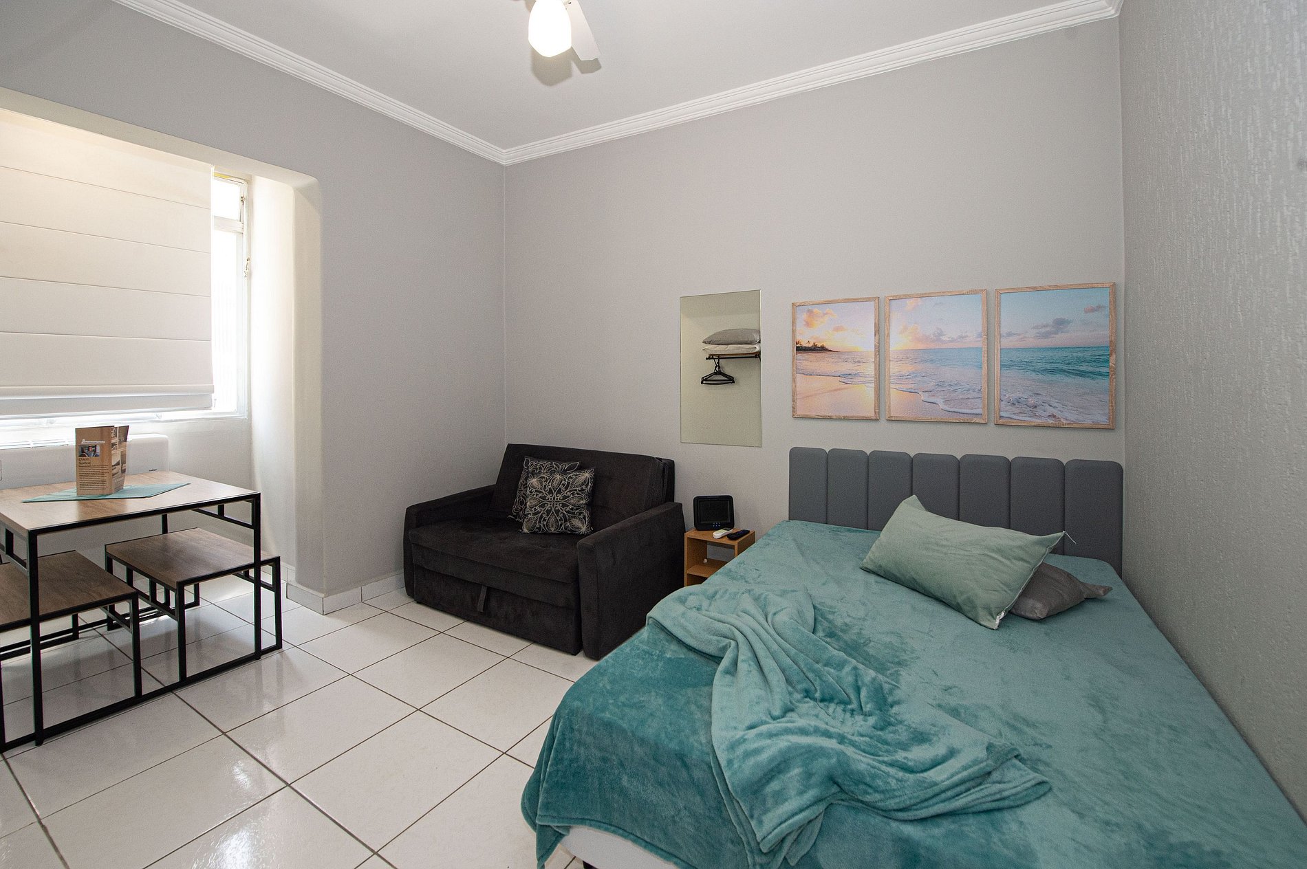 A voltagem do apartamento é 110V. Não fornecemos lençóis e toalhas, apenas travesseiros. O apartamento comporta no máximo 3 hóspedes. Não possuímos vaga de garagem, mas há estacionamentos pagos próximos, como o Estacionamento Itararé Park (Av. Pres. Wilson, 75) e o Estacionamento Praia Itararé (Rua João Ramalho, 50) — ambos a poucos minutos a pé.