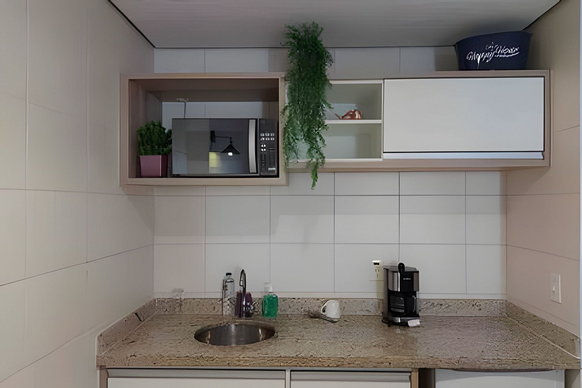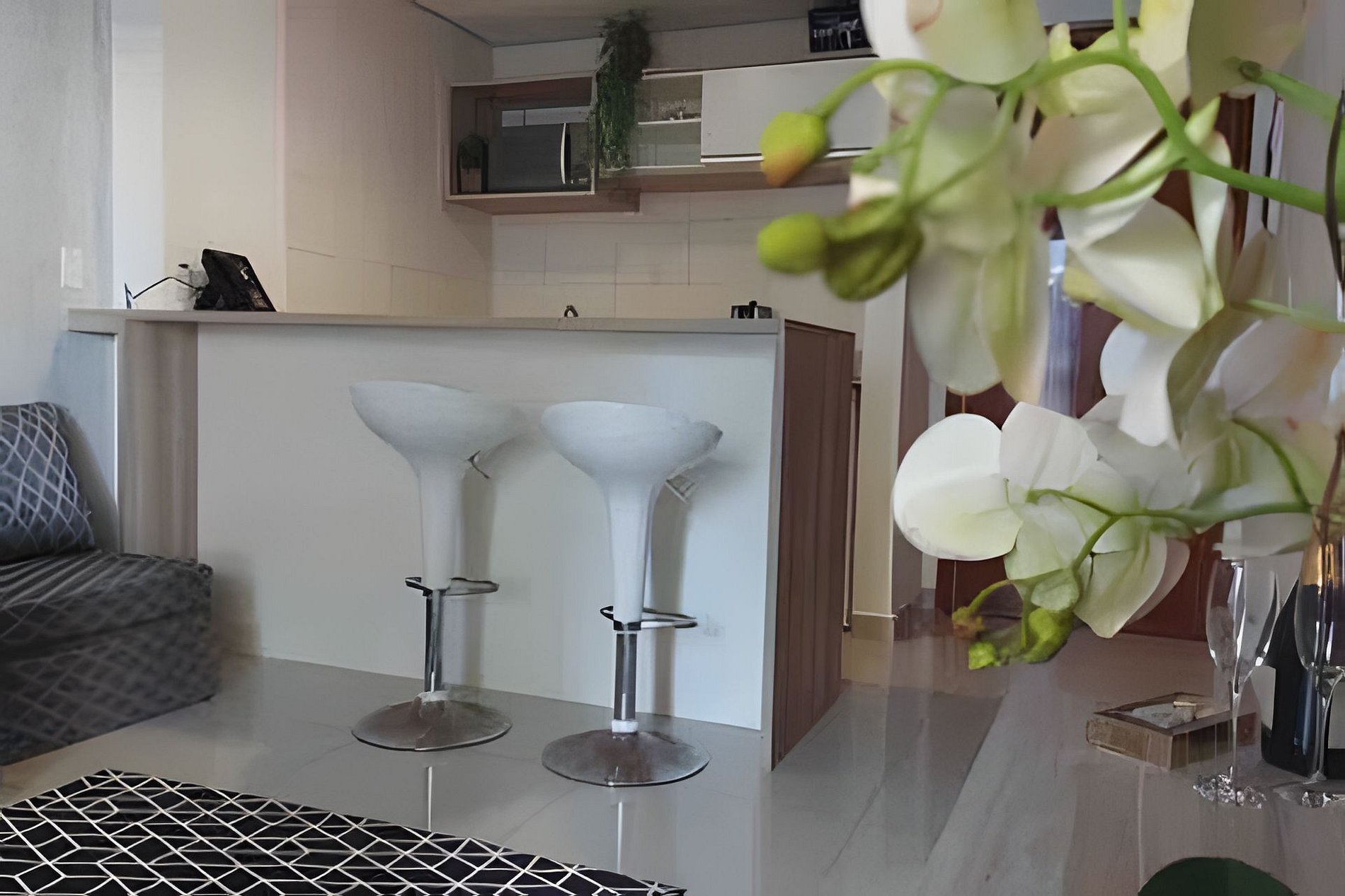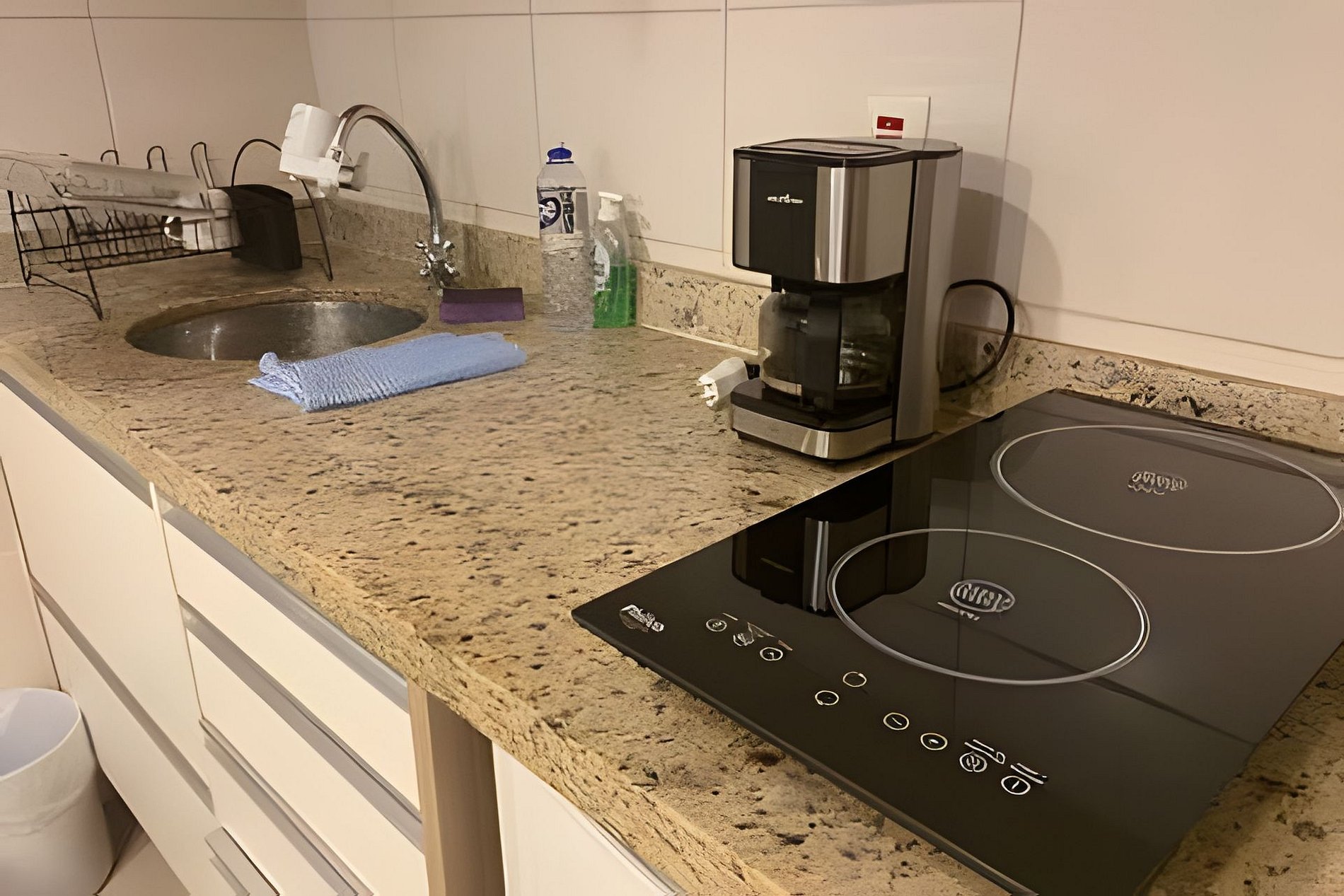 A cozinha americana conta com cooktop de indução 2 bocas (frituras proibidas), micro-ondas, cafeteira, geladeira, forno elétrico, sanduicheira, panelas e utensílios básicos, perfeita para refeições simples.
