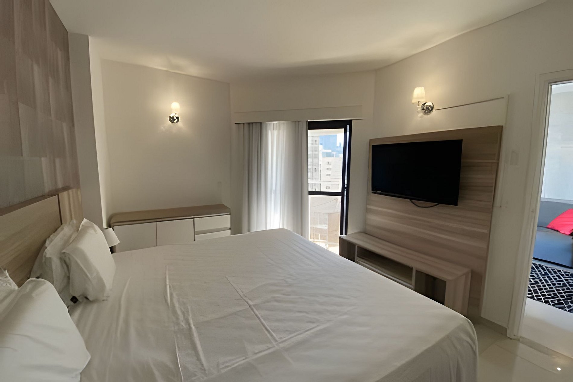 O apartamento tem 1 dormitório (suíte) com cama king size, sala com sofá-cama e uma sacada com linda vista para o mar, ideal para relaxar e curtir o pôr do sol.