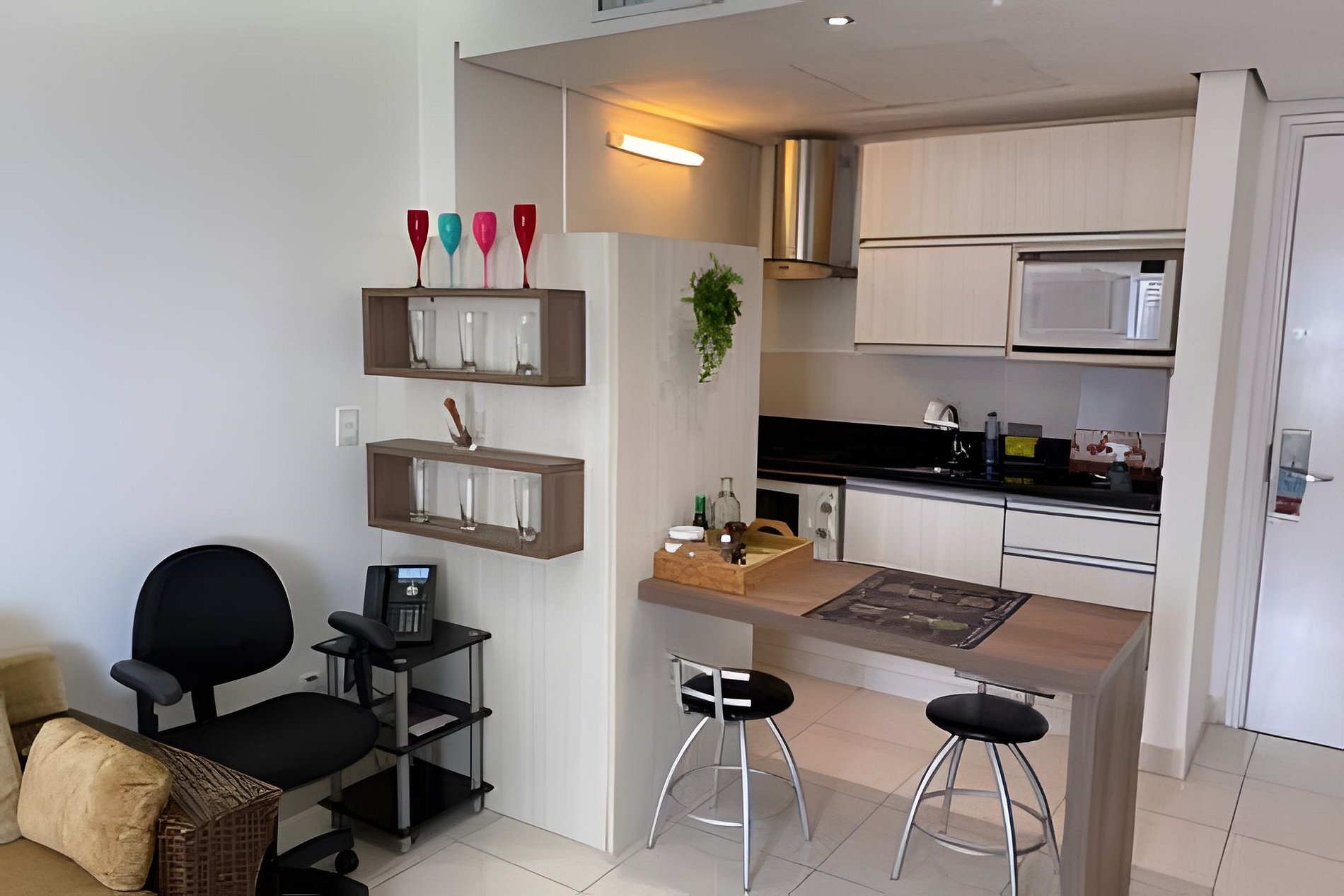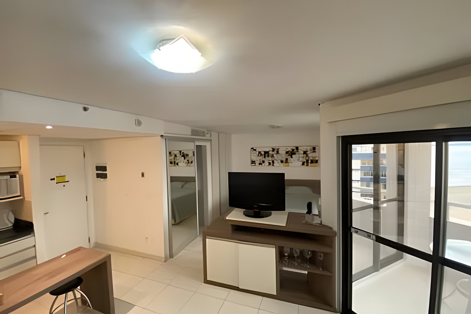 O apartamento possui um dormitório (suíte) mobiliado com cama queen, integrado à sala, que conta também com um sofá-cama. Você poderá desfrutar de uma sacada agradável com uma linda vista para o mar. A cozinha está equipada com fogão cooktop de 2 bocas, forno e micro-ondas, oferecendo comodidade para preparar pequenas refeições.