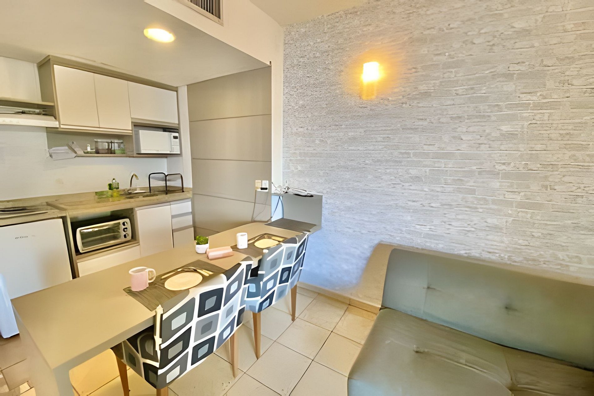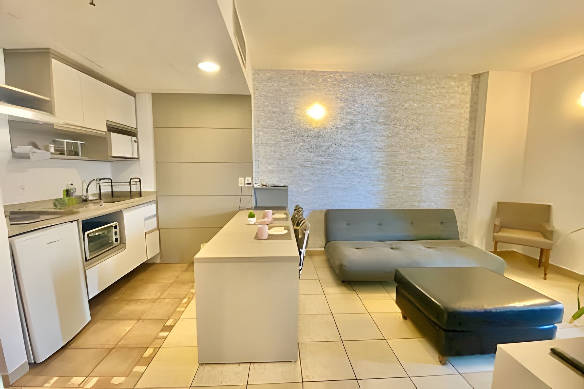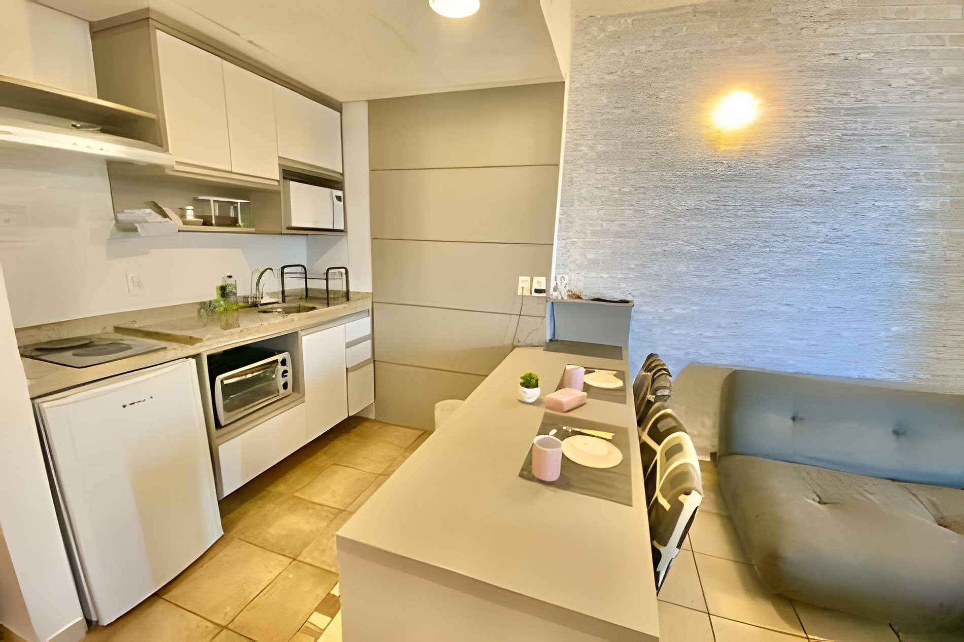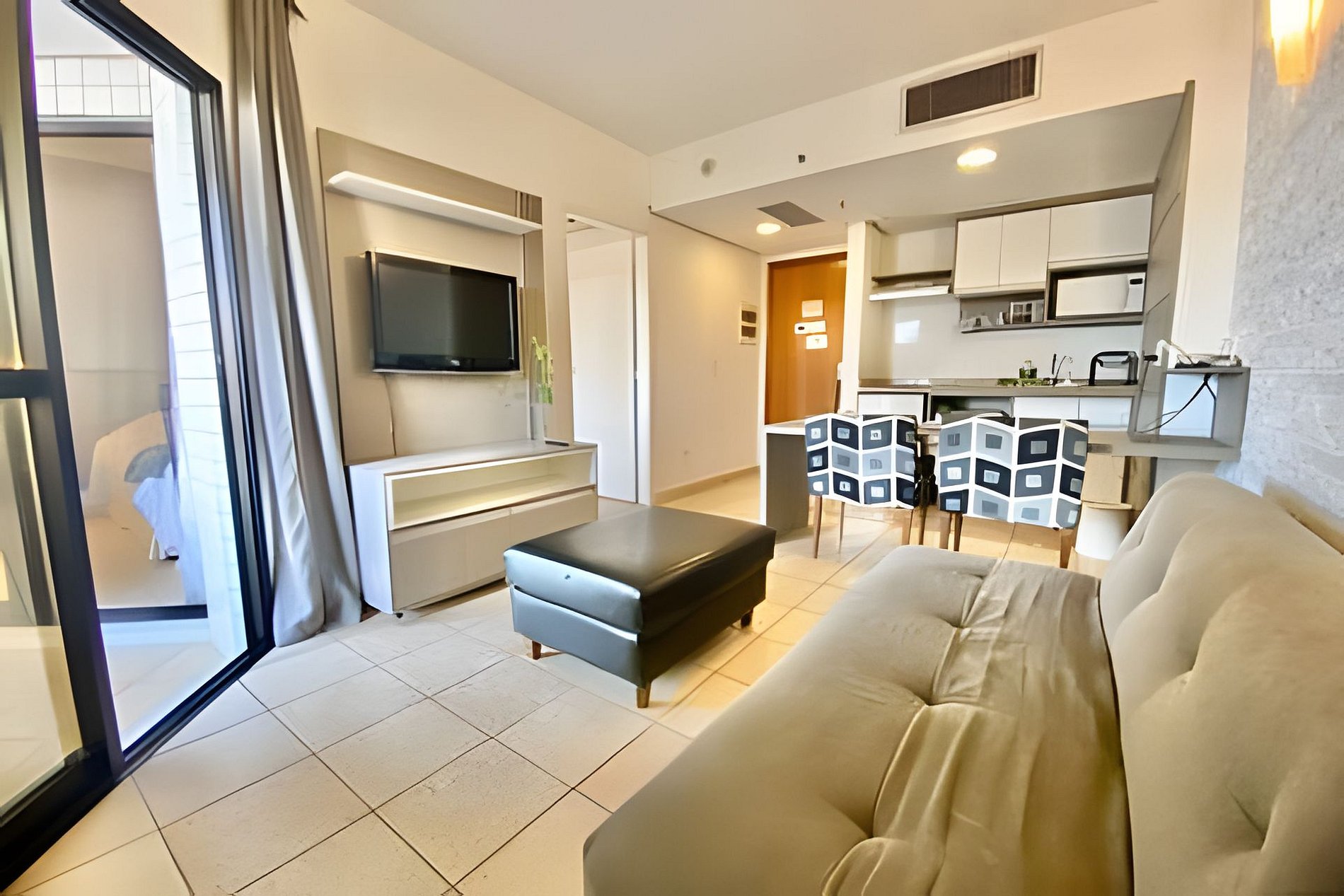 O imóvel conta com serviço de arrumação, Wi-Fi de alta velocidade, ar-condicionado na sala e suíte, fogão de indução, frigobar, micro-ondas, cafeteira, louças e talheres.
