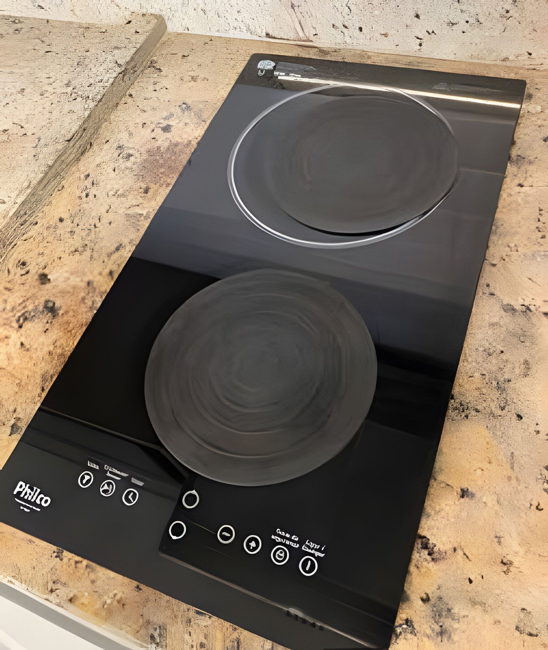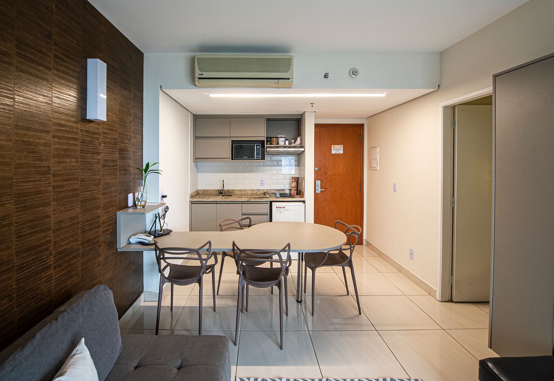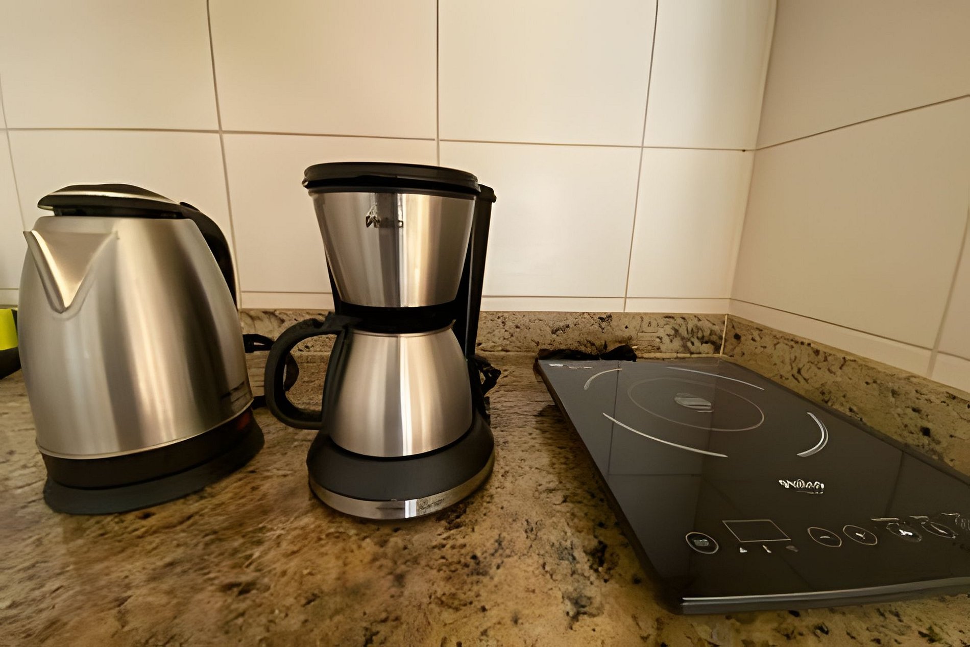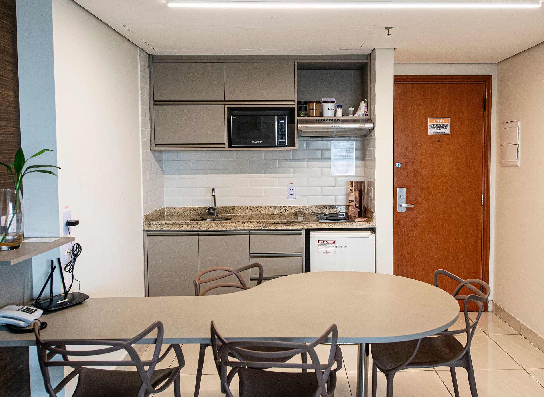 A cozinha americana é equipada com cooktop de indução de 2 bocas, panelas de indução, louças, micro-ondas, cafeteira e utensílios domésticos básicos, perfeita para pequenas refeições.