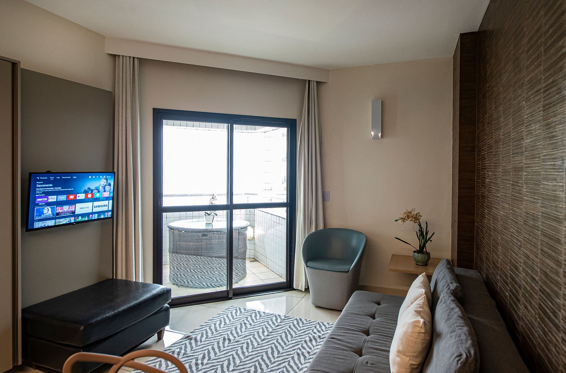 O imóvel conta com serviço de limpeza, barraca de praia aos finais de semana, Wi-Fi, ar-condicionado na sala e no quarto, e cozinha equipada com cooktop de 2 bocas e frigobar. Smart TVs na sala e no quarto. O condomínio oferece piscina e academia com vista panorâmica.