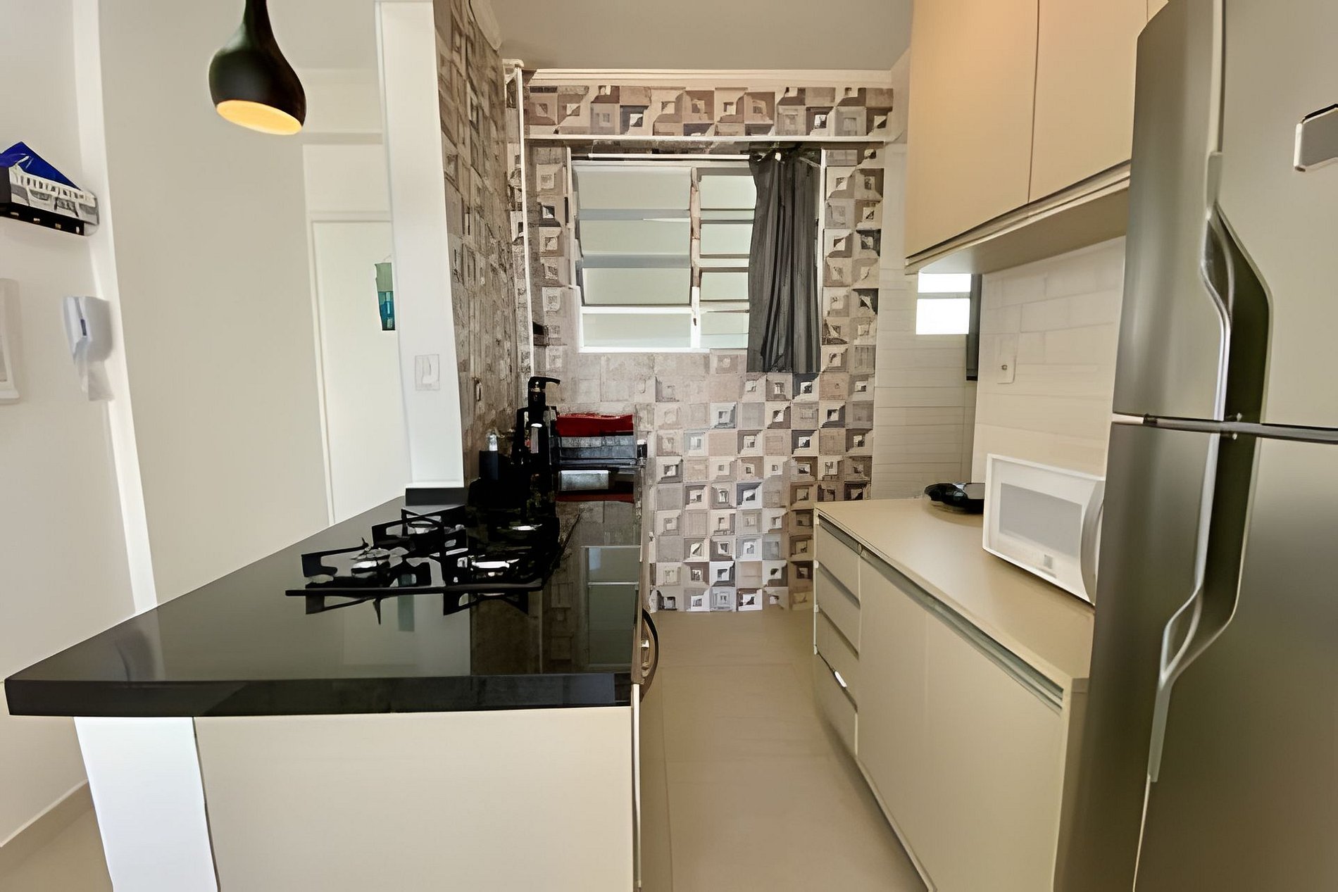 A cozinha está totalmente equipada com fogão, micro-ondas, geladeira 2 portas, forno, torradeira, panelas e utensílios básicos. Integrada à sala, proporciona conforto e interação para família e amigos.