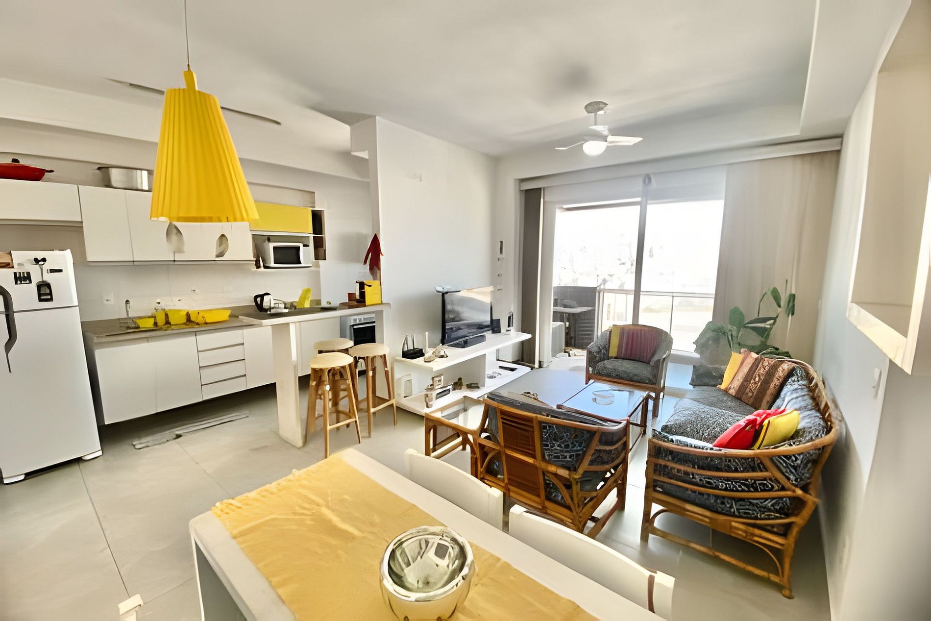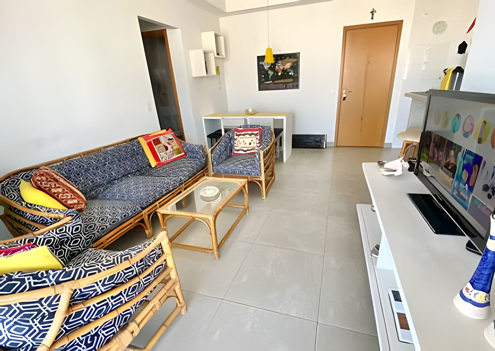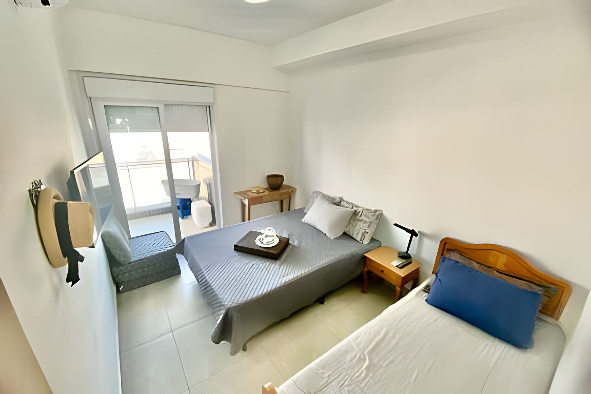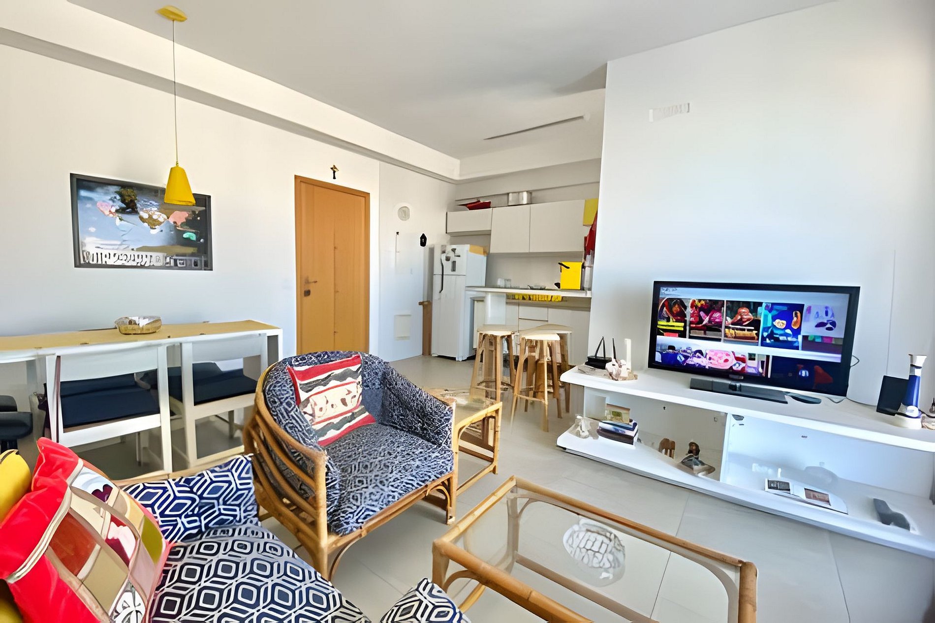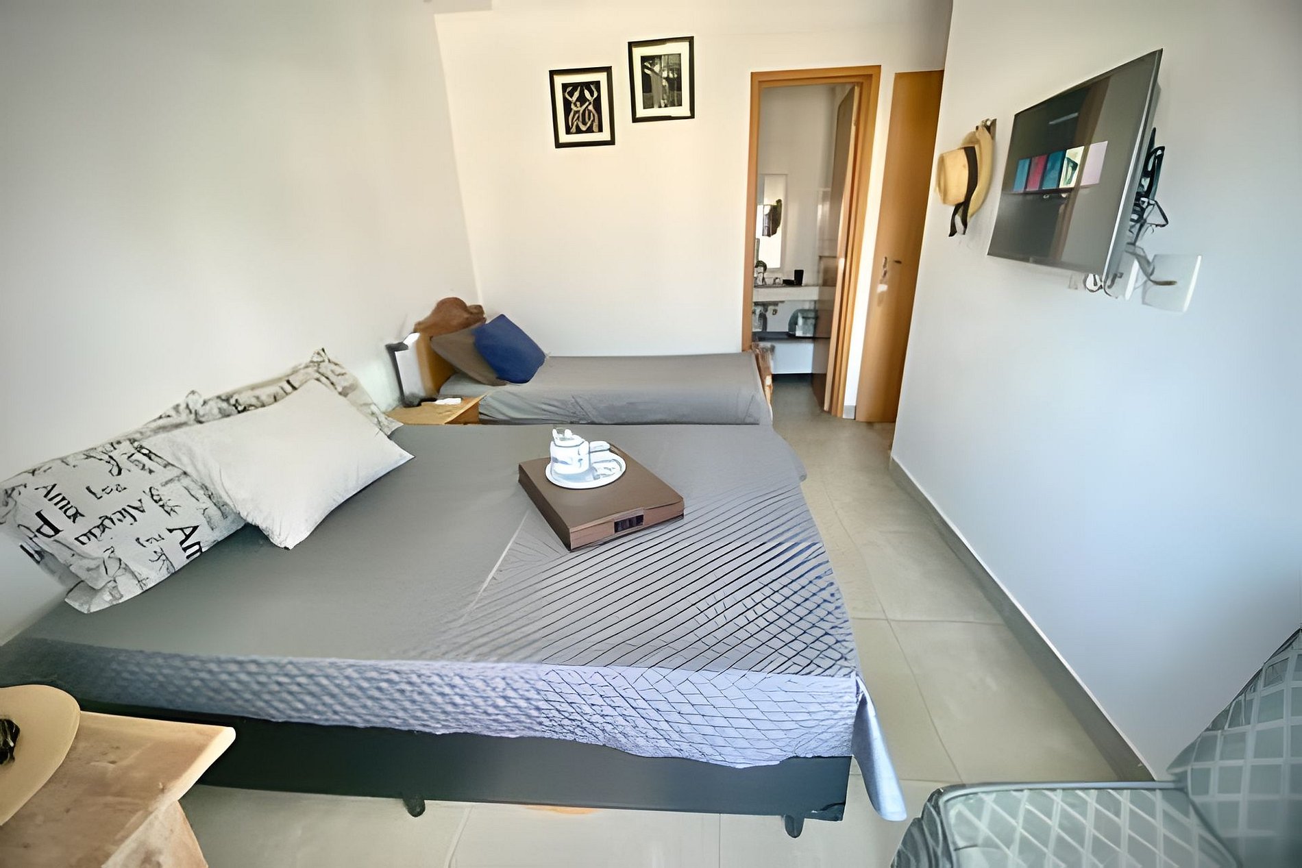 A suíte conta com cama de casal, cama de solteiro, TV 32” e ar-condicionado. O segundo quarto tem cama de solteiro e colchão extra (sem ar). A sala dispõe de sofá, mesa de jantar e TV 40” com canais variados.