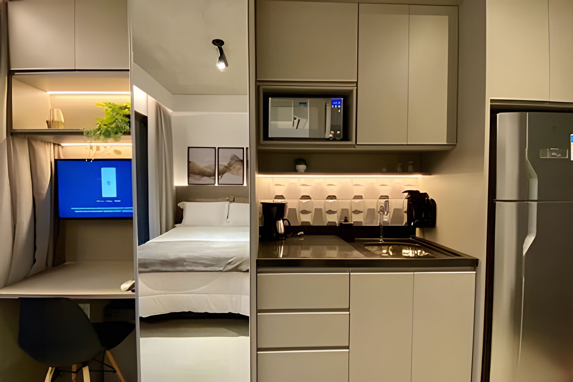 Nessa Studio, você contará com: - Cozinha Compacta com geladeira e utensílios de cozinha - Cooktop e microondas - Cafeteira elétrica - Fast Wi-fi, ótimo para home office - Smart TV - Cama com enxoval de hotel - Guarda roupa - Banheiro com chuveiro - Toalhas Sejam bem-vindos!