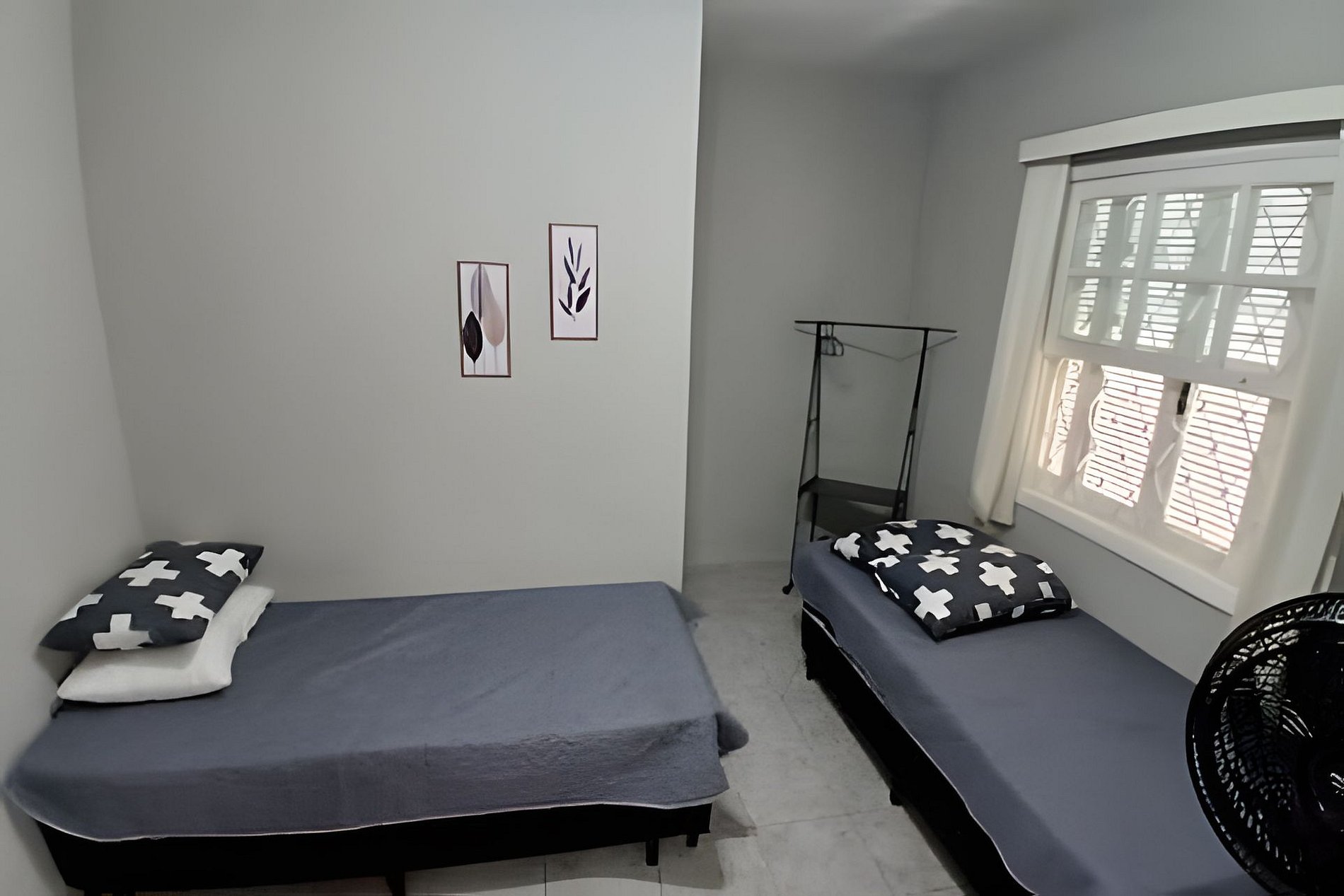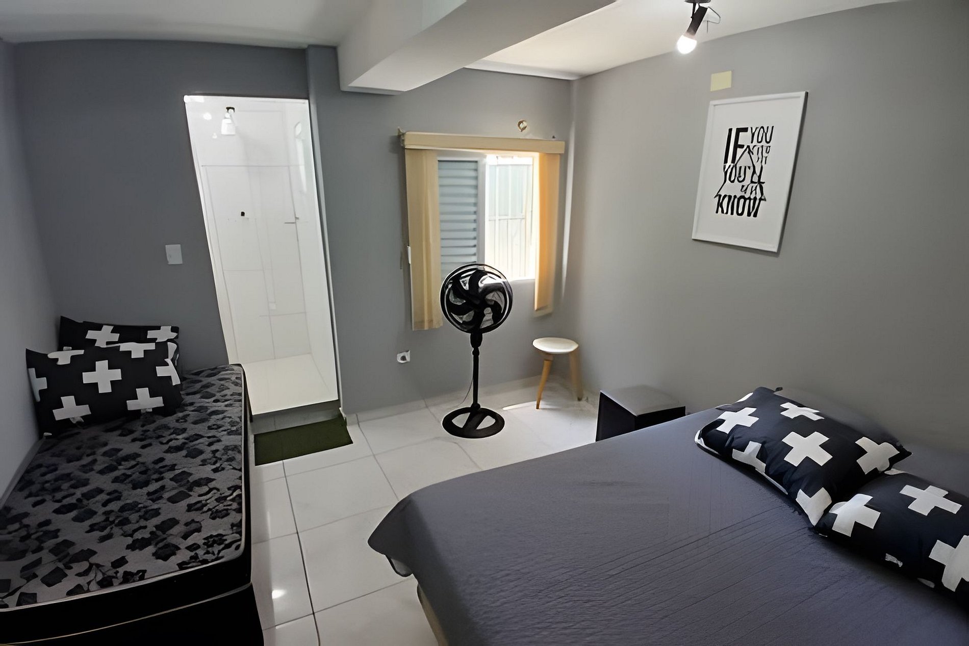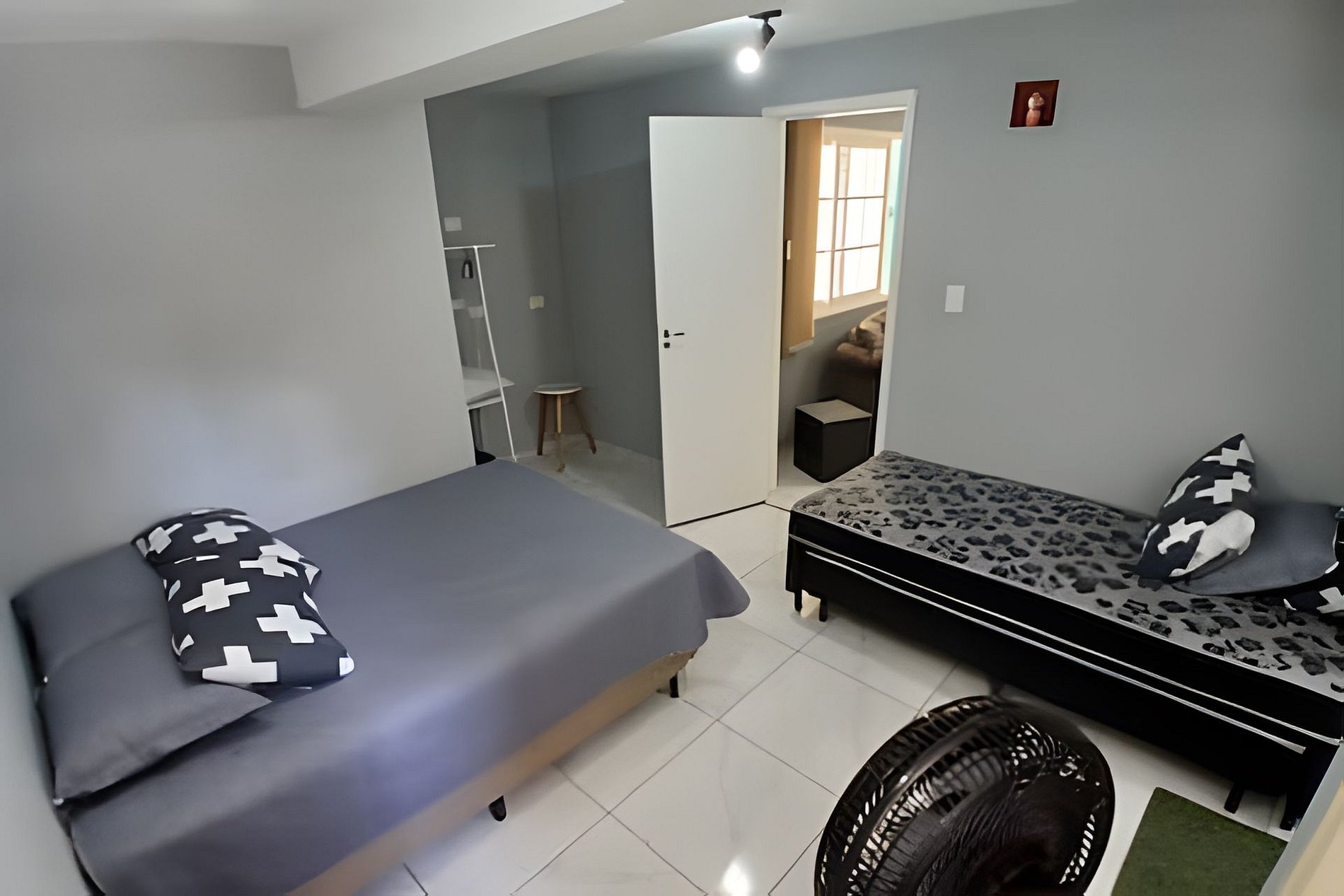 A casa possui três quartos, sendo duas suítes que garantem mais privacidade aos hóspedes, além de um banheiro comum que atende bem às áreas compartilhadas. Acomoda confortavelmente até 12 pessoas, com bicamas localizadas sob as camas de solteiro para melhor aproveitamento do espaço.