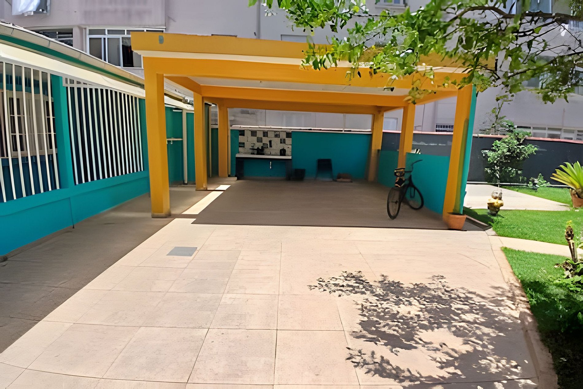 O quintal é amplo, com área verde e um espaço kids, onde as crianças podem brincar com segurança enquanto os adultos descansam.