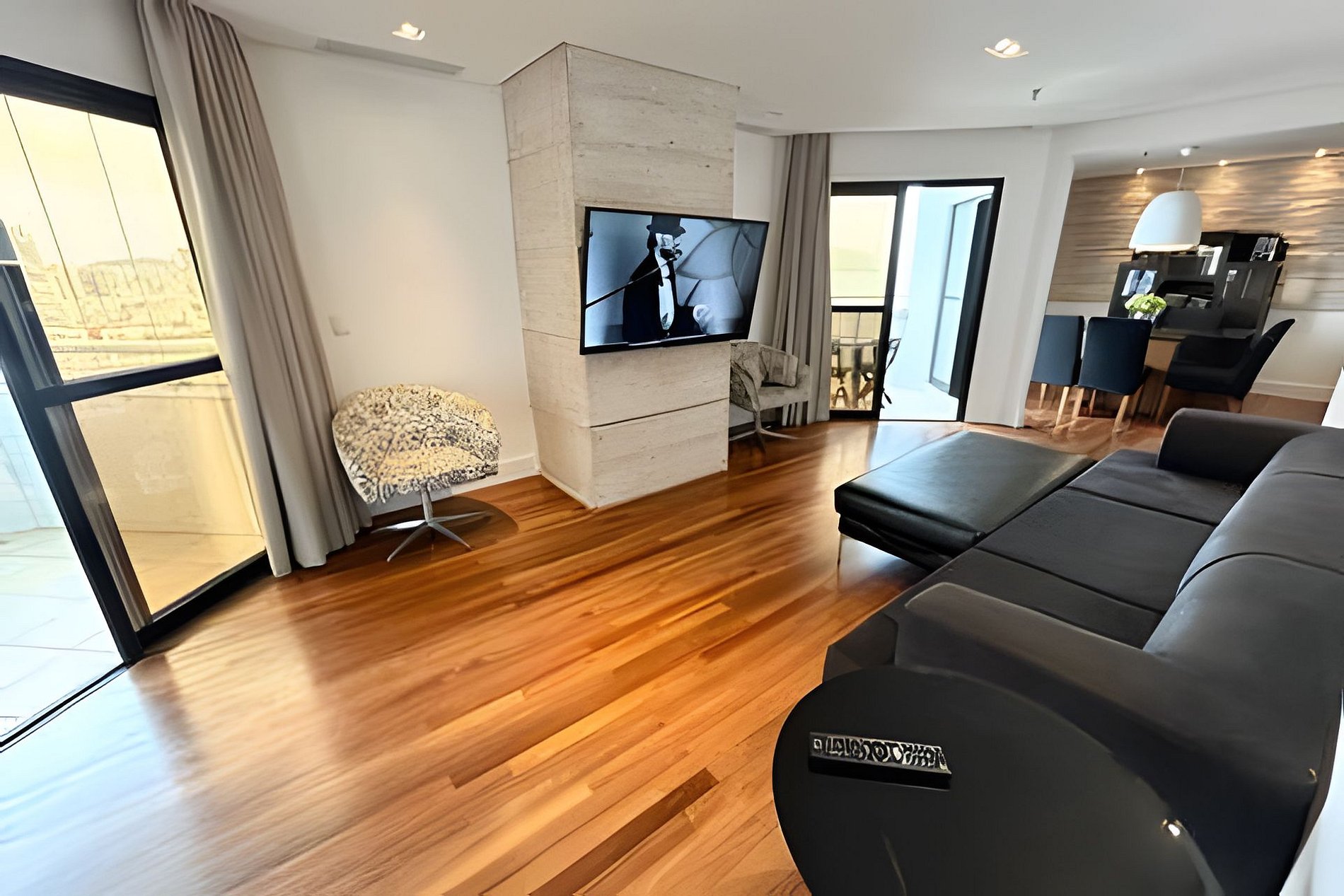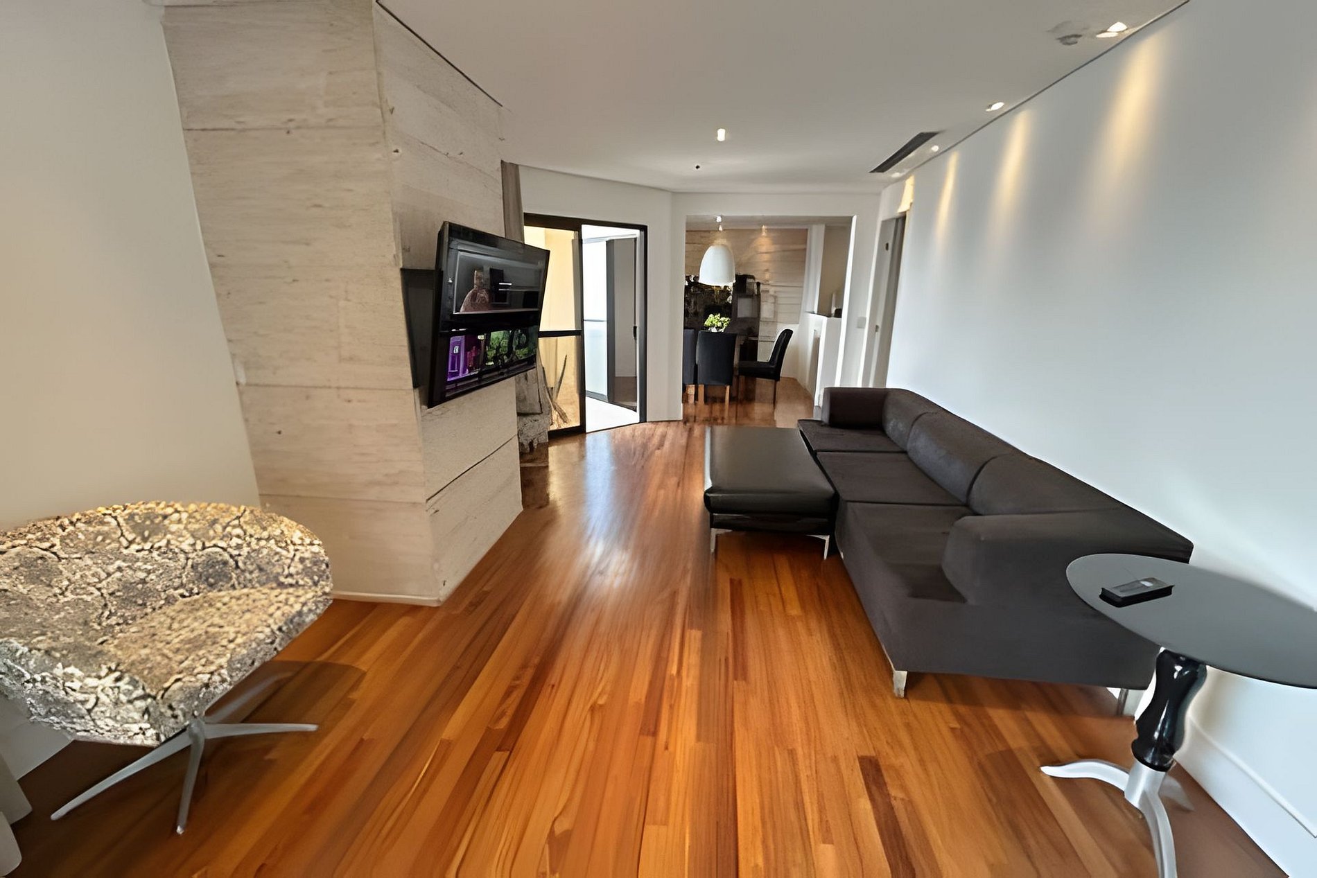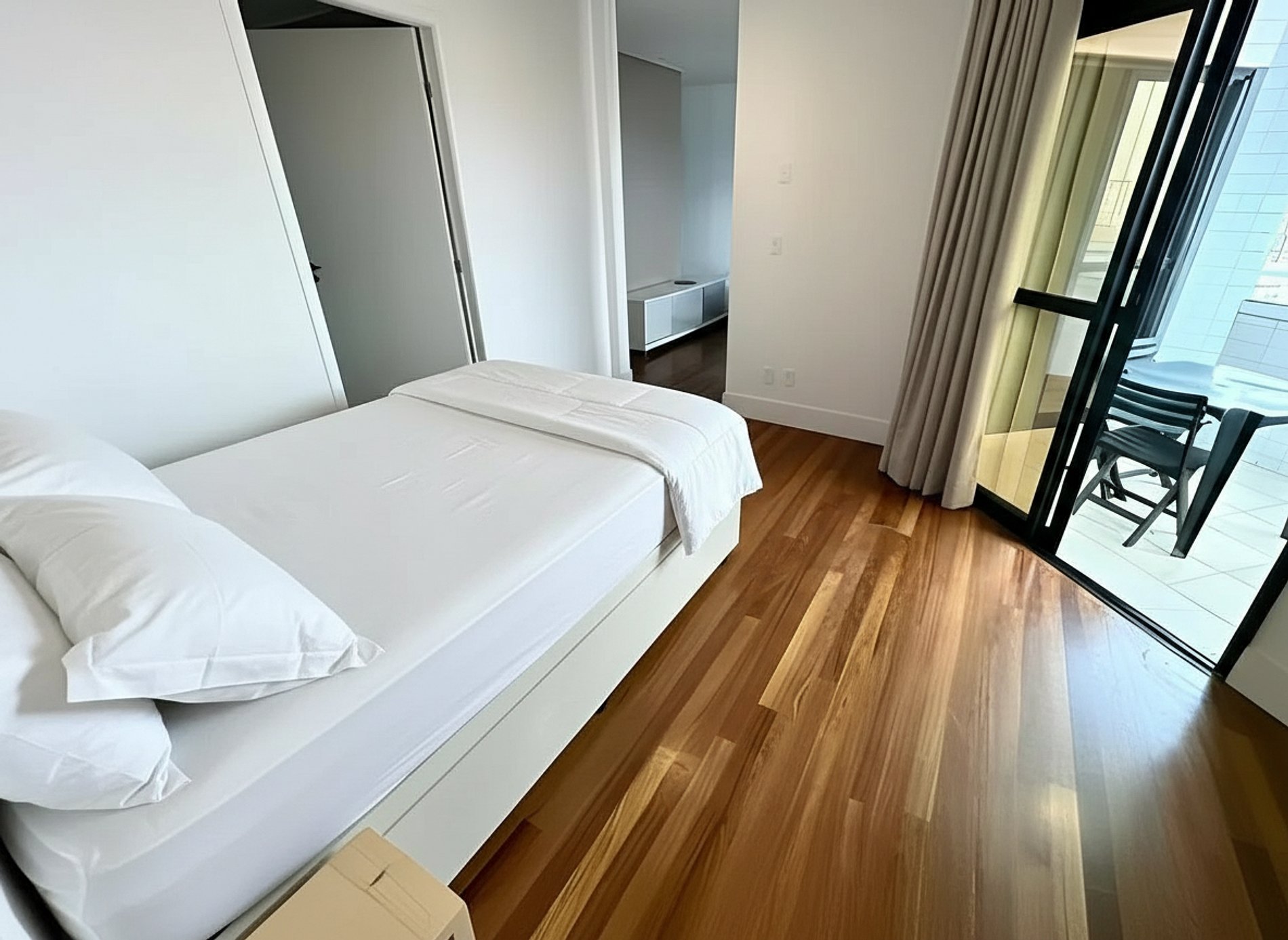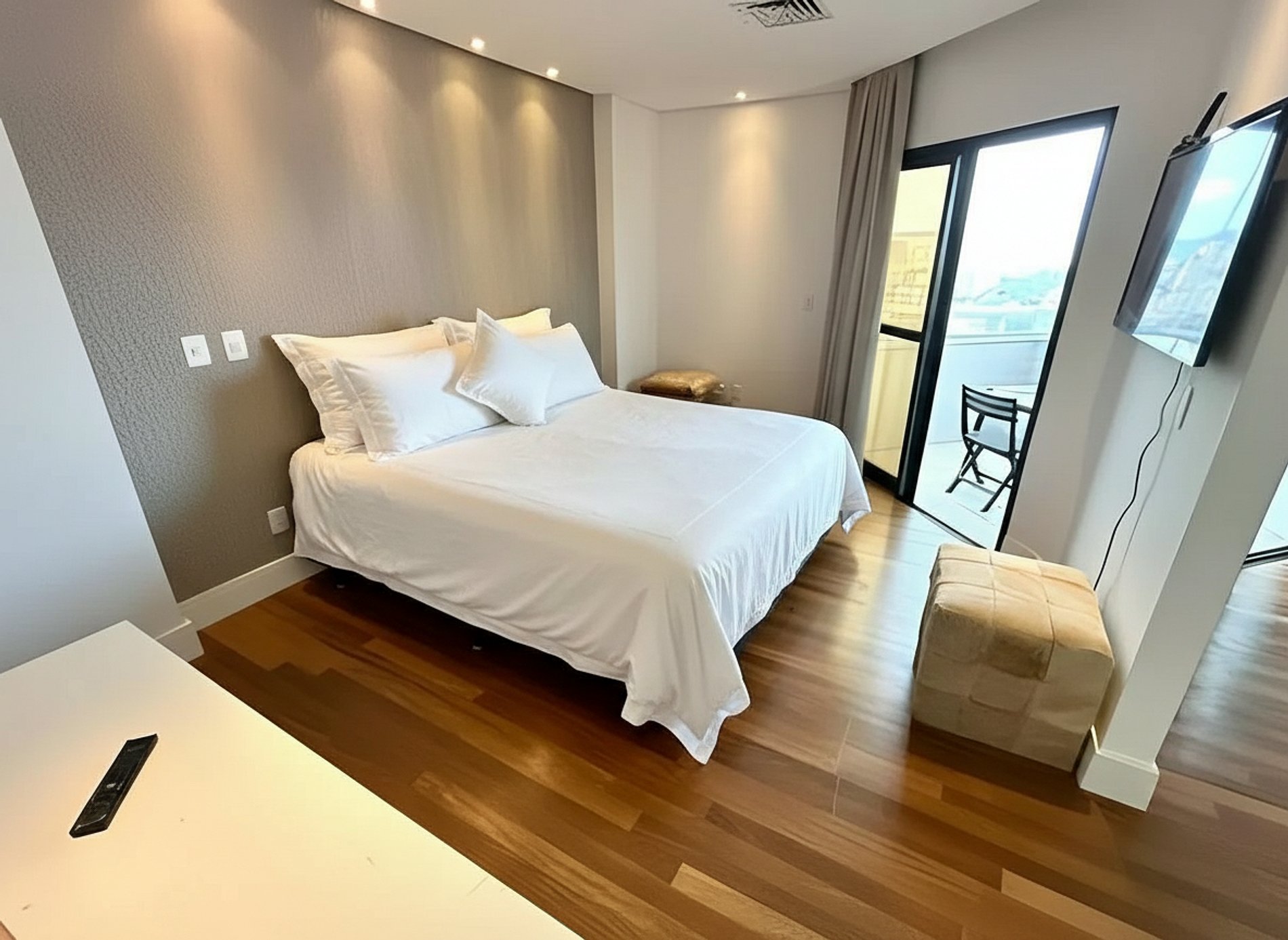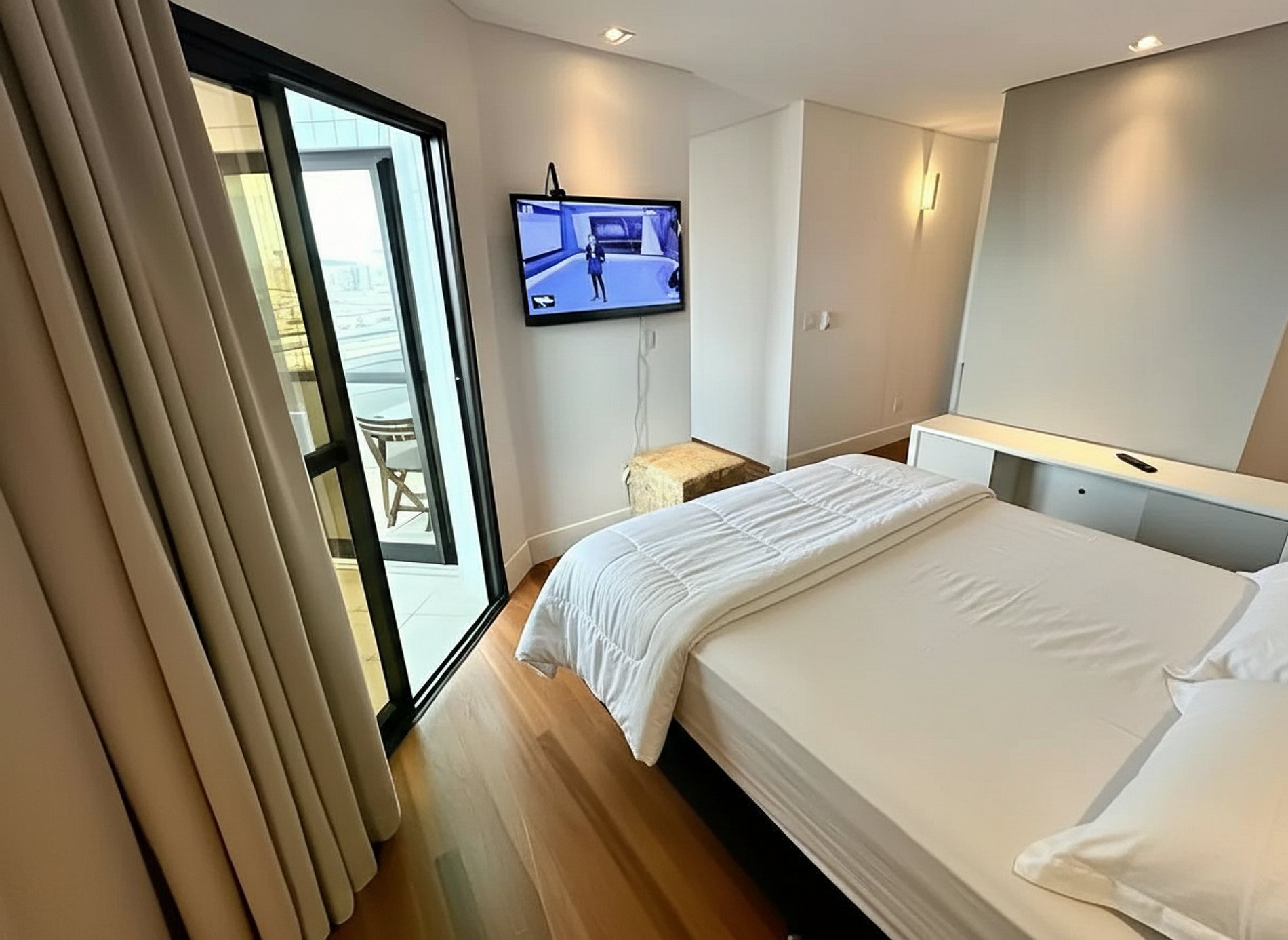 Nossos hóspedes terão acesso exclusivo ao apartamento completo, que inclui sala de TV, cozinha integrada, quarto, banheiro e sacada.