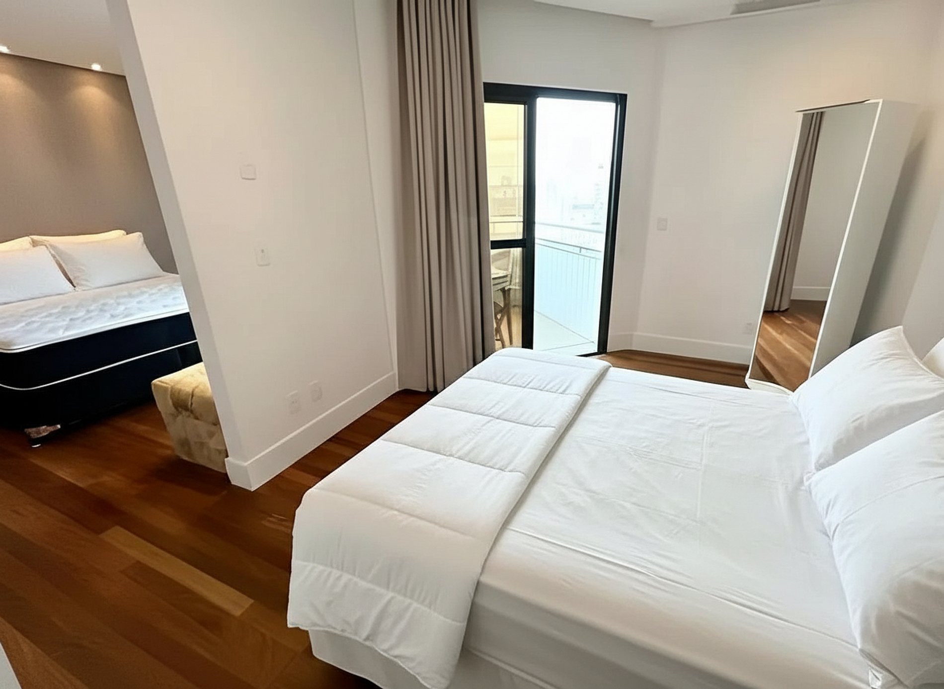 Super Host Brasil oferece amplo apartamento para até 8 hóspedes, com três quartos interligados, cada um com cama de casal, dois banheiros e um lavabo para maior conforto.