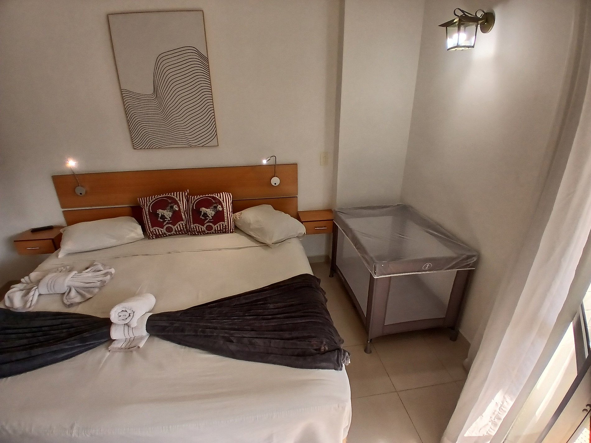 O quarto, com cama de casal, berço portátil e ar-condicionado, vai te encantar. A sala acolhe você com um confortável sofá-cama e uma TV de 32''. A cozinha está equipada com frigobar, cooktop 2 bocas, micro-ondas, cafeteira elétrica.