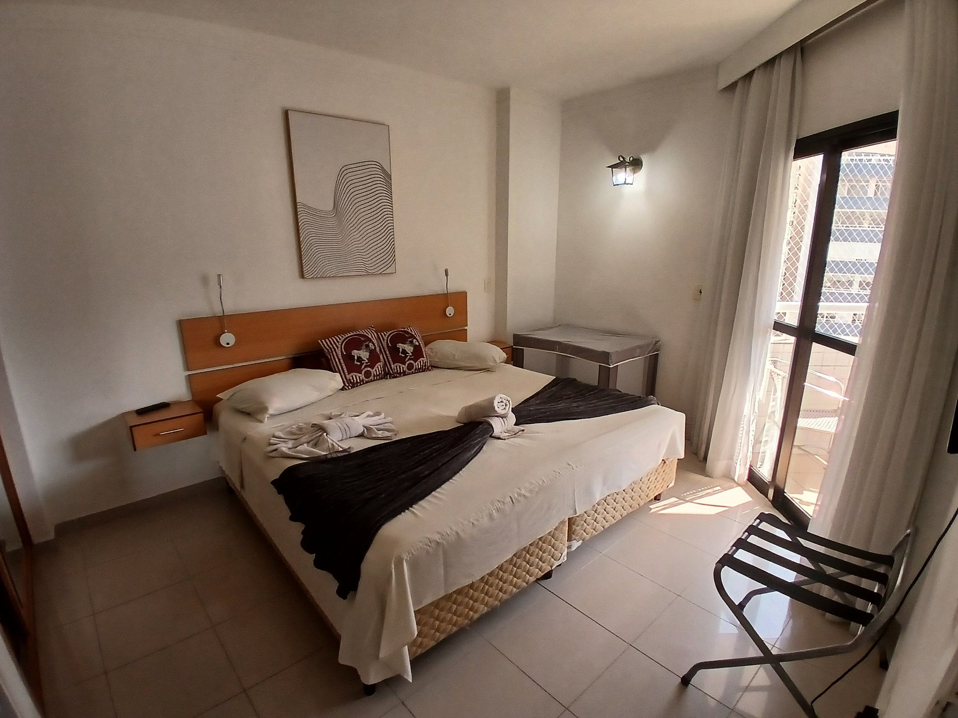 Para seu conforto, oferecemos roupas de cama e toalhas para dois hóspedes! O apartamento acomoda até 4 pessoas, garantindo uma estadia agradável e aconchegante. O quarto possui ar-condicionado para noites tranquilas, e a sala também conta com ar-condicionado para manter o frescor. O prédio dispõe de uma vaga! A voltagem do apartamento é 220v. Ah, e temos travesseiros confortáveis para todos os hóspedes!