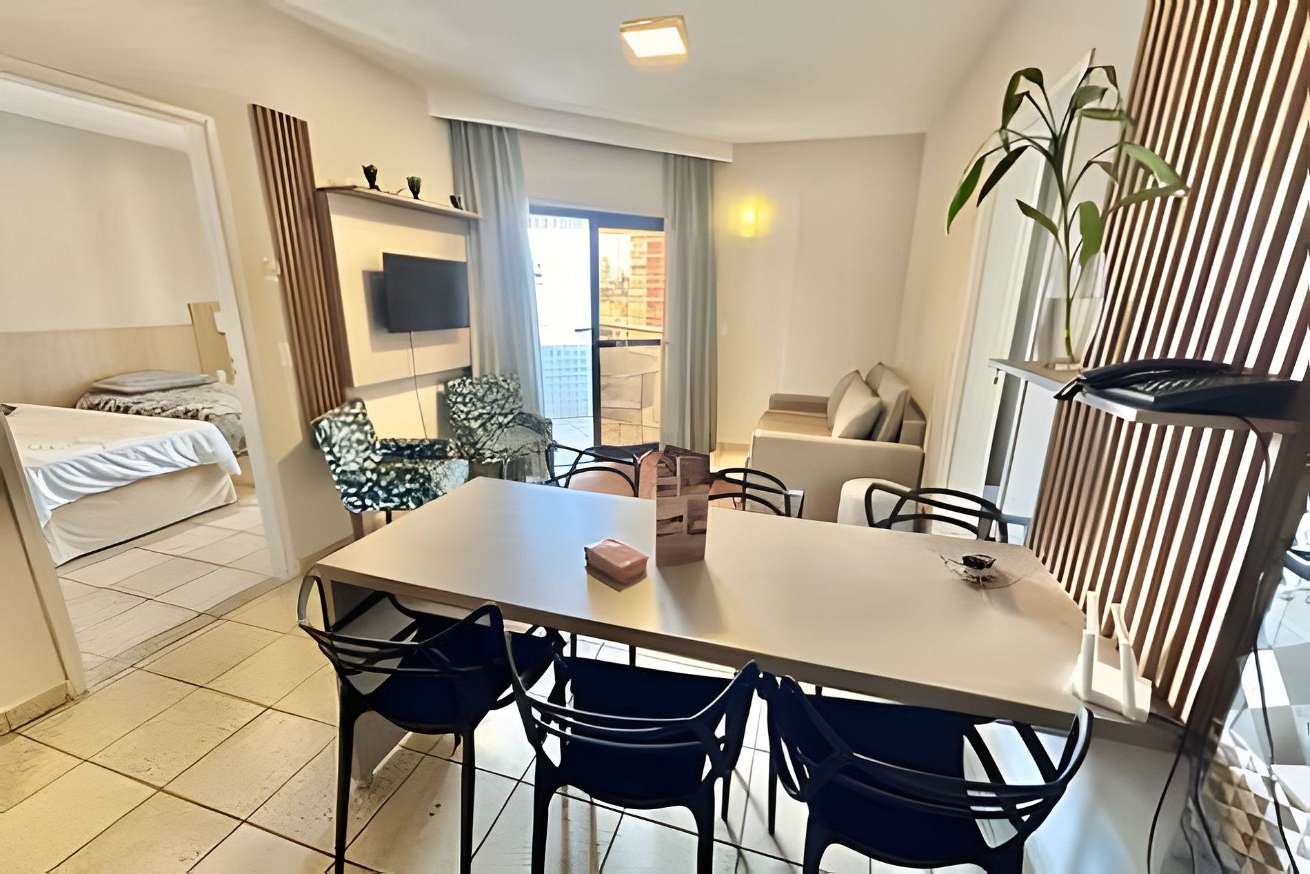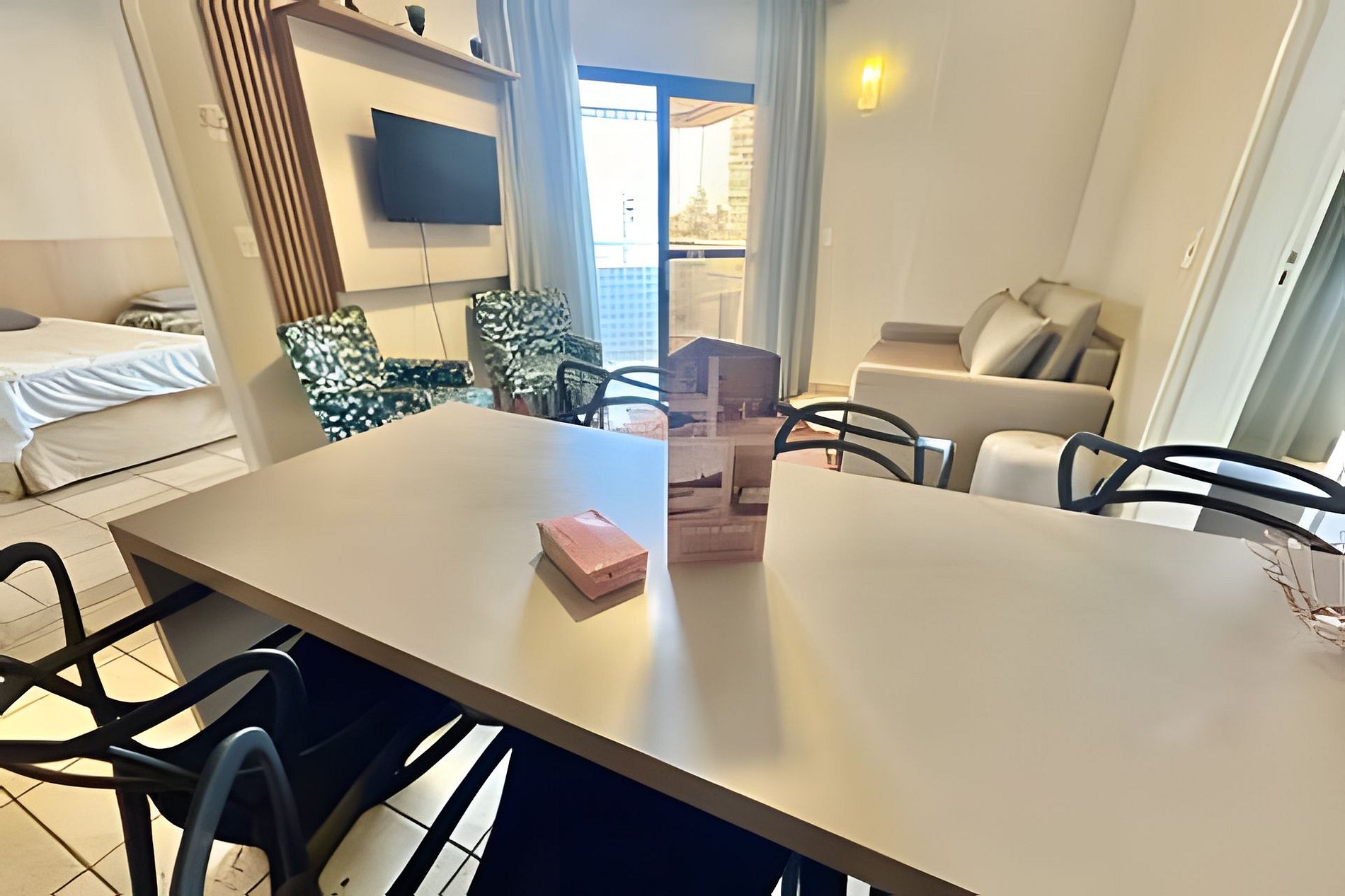 Temos 2 suítes, uma sala com sofá cama e uma pequena cozinha equipada com fogão de indução 2 bocas, frigobar, micro, cafeteira, louças e talheres.. Os hospedes terão acesso ao apto inteiro, que possui dois dormitórios, sendo um com cama de casal padrão e o outro com 2 camas de solteiro. Além de um sofá cama na sala que comporta bem 2 crianças. Contarão ainda com a segurança de um apto inteiramente telado, com sacada vista mar (lateral). Poderão também usufruir de toda a area de lazer do prédio: piscina com vista panorâmica e academia.