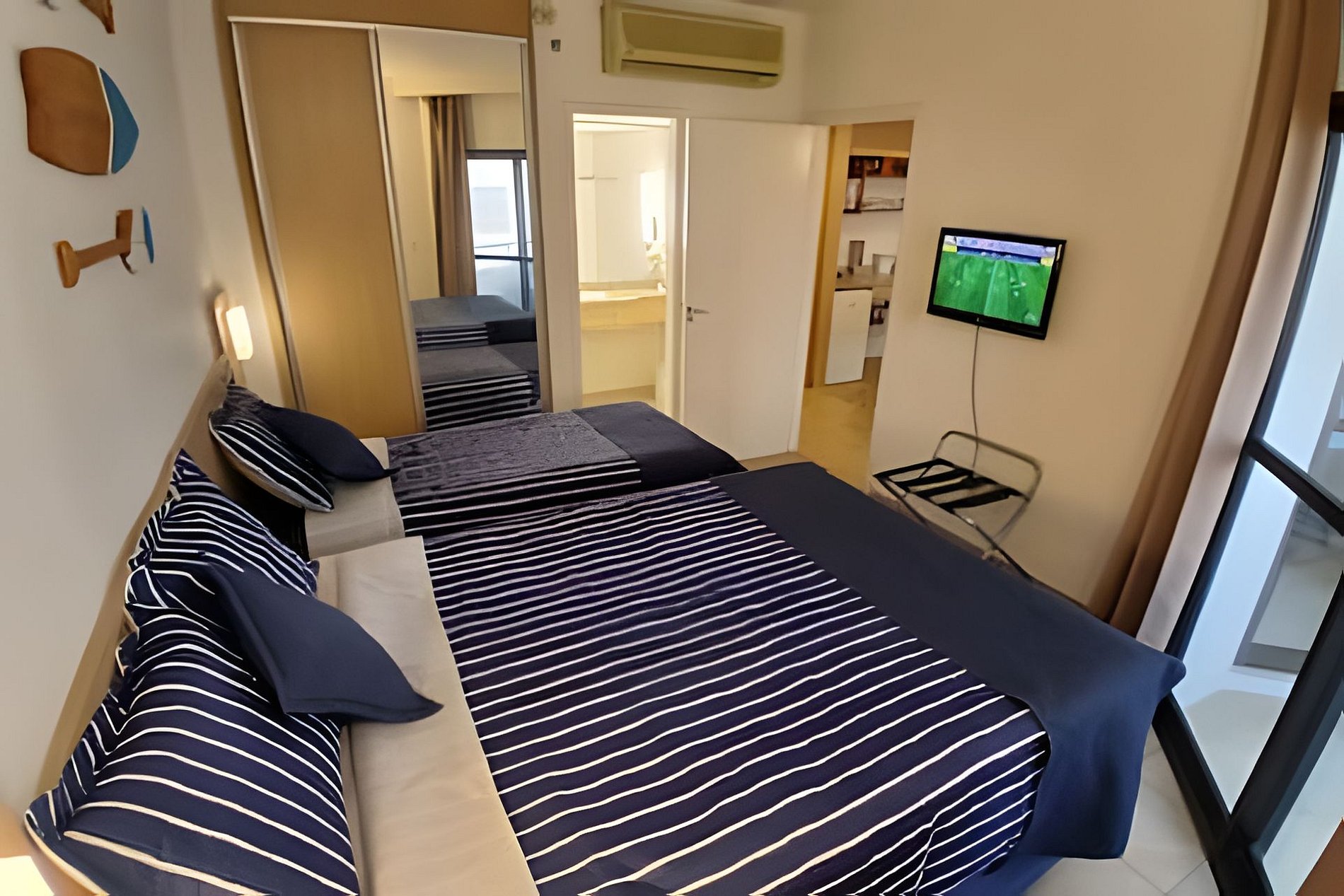 Conta com suíte equipada com cama king size e ar-condicionado no quarto e na sala, acomodando até 4 pessoas.