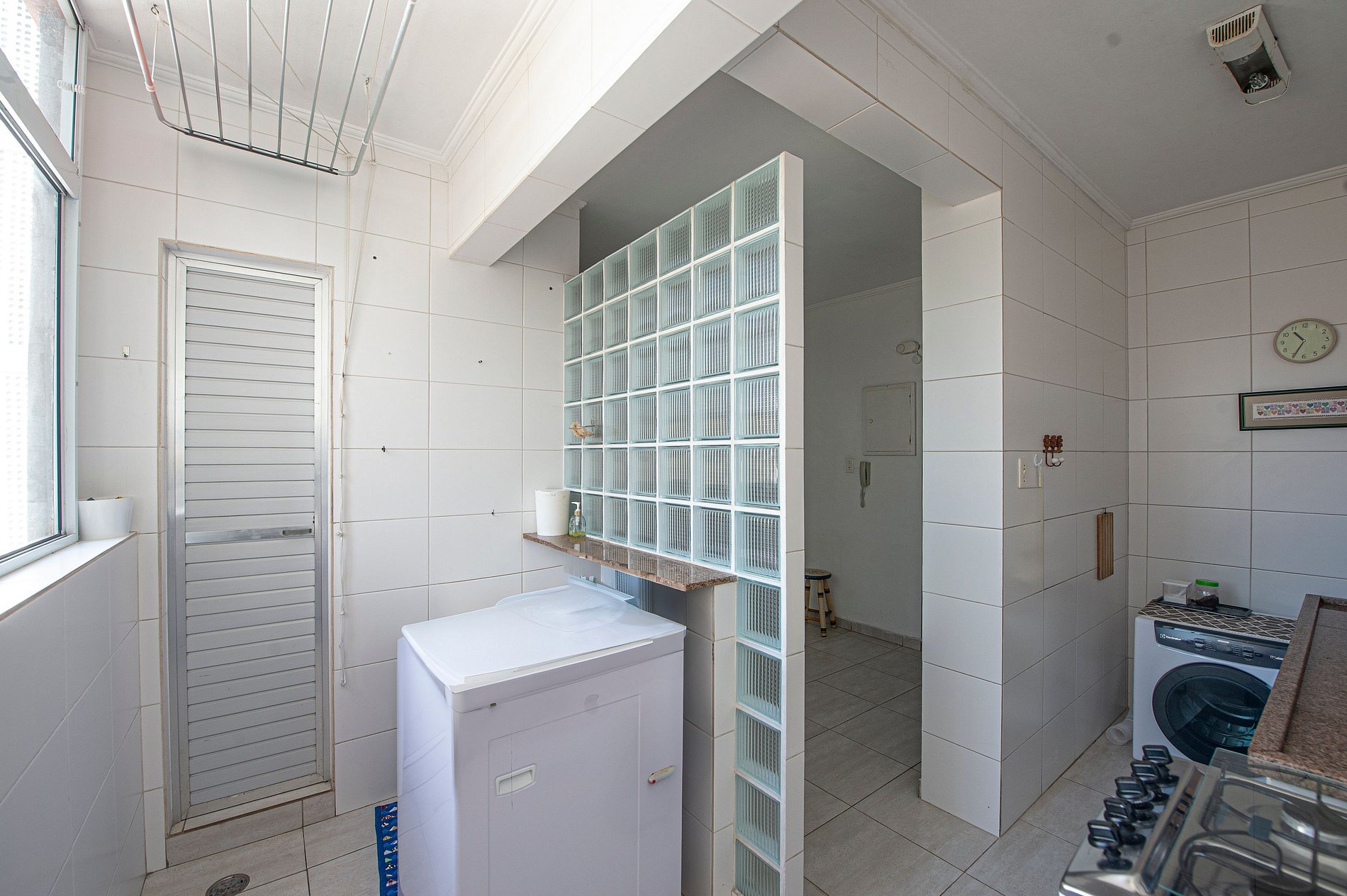 Área de serviço com lavadora e secadora.