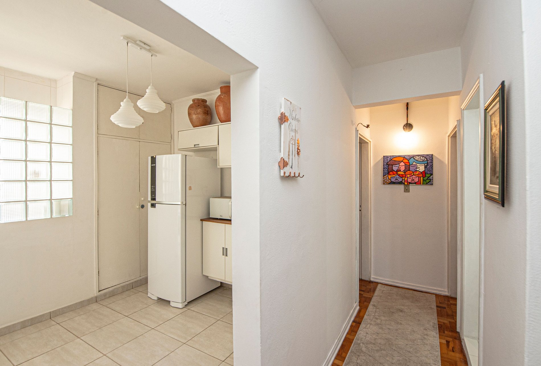 A cozinha está equipada com micro-ondas, torradeira, liquidificador e utensílios básicos para preparar refeições.